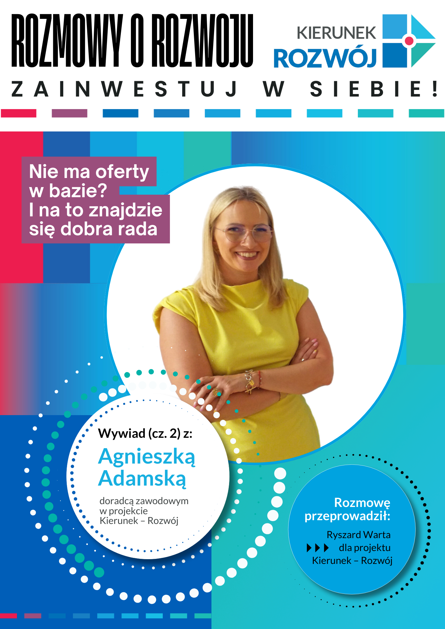 To seria inspirujących rozmów prowadzonych przez dziennikarza Ryszarda Wartę dla projektu Kierunek – Rozwój, który pyta swoich gości – ekspertów, doradców zawodowych i uczestników projektu – o to, co naprawdę liczy się w rozwoju zawodowym. W rozmowach pojawiają się wątki dotyczące: