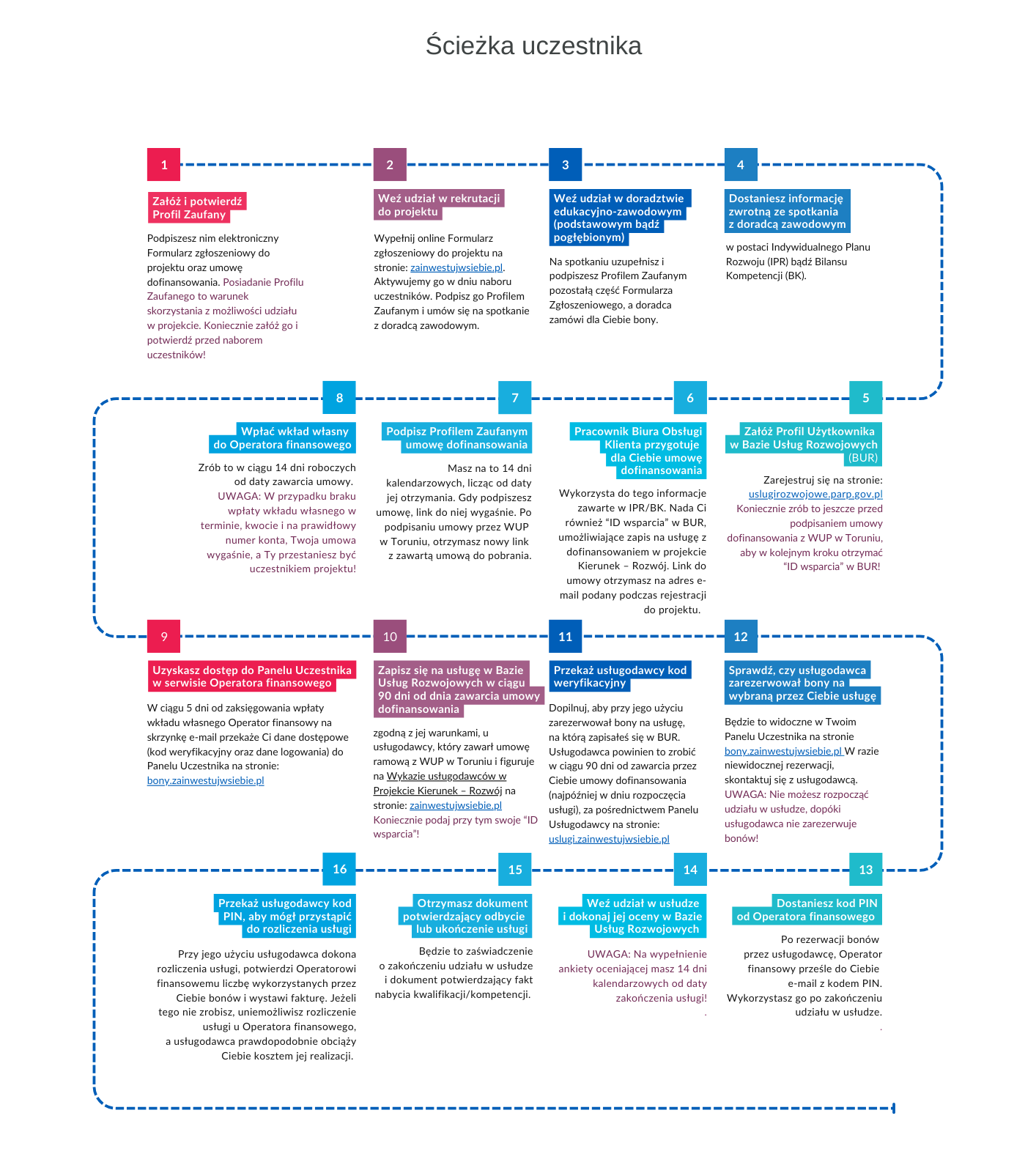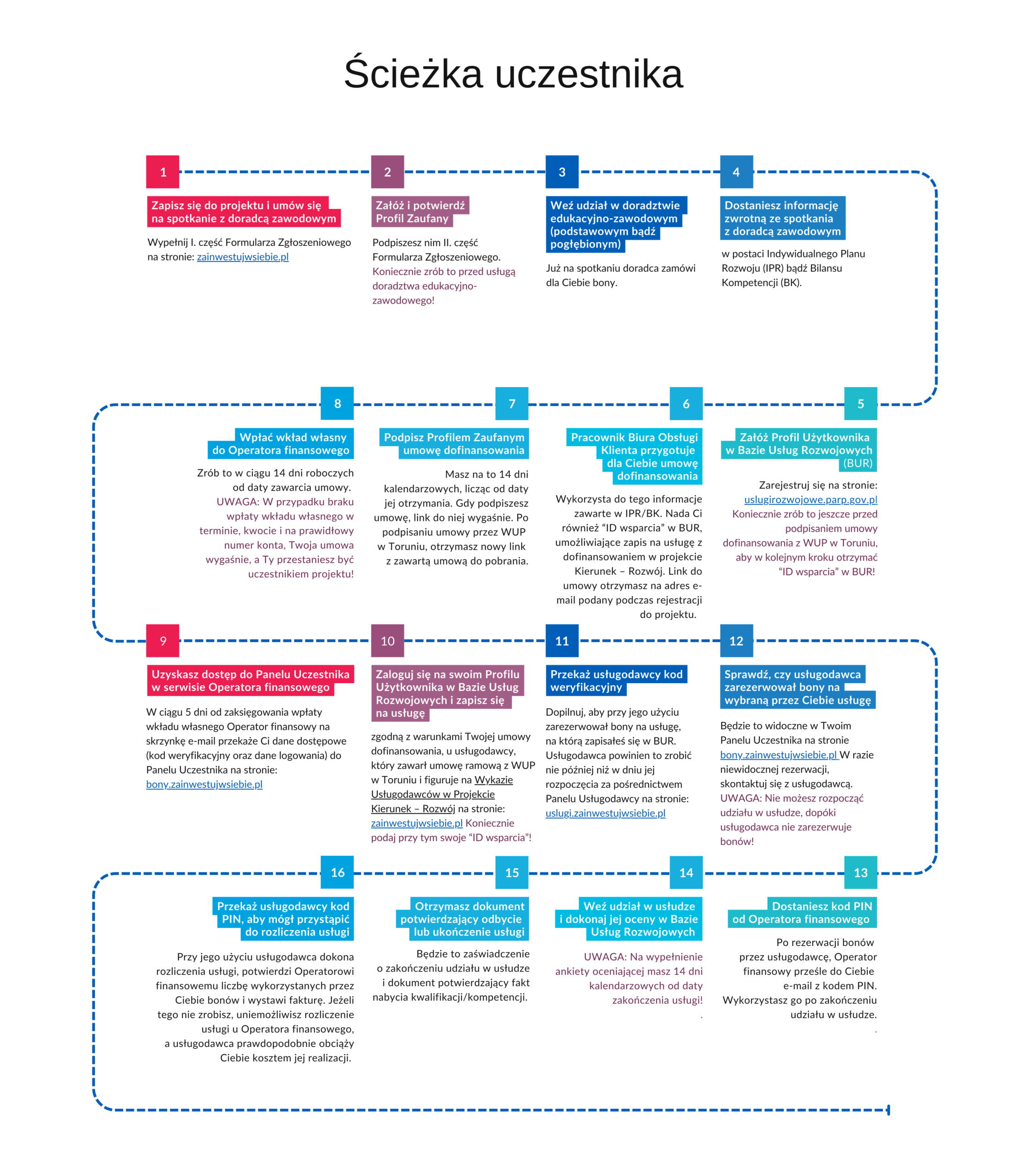 Ścieżka uczestnika w projekcie Kierunek – Rozwój jeszcze bardziej szczegółowo